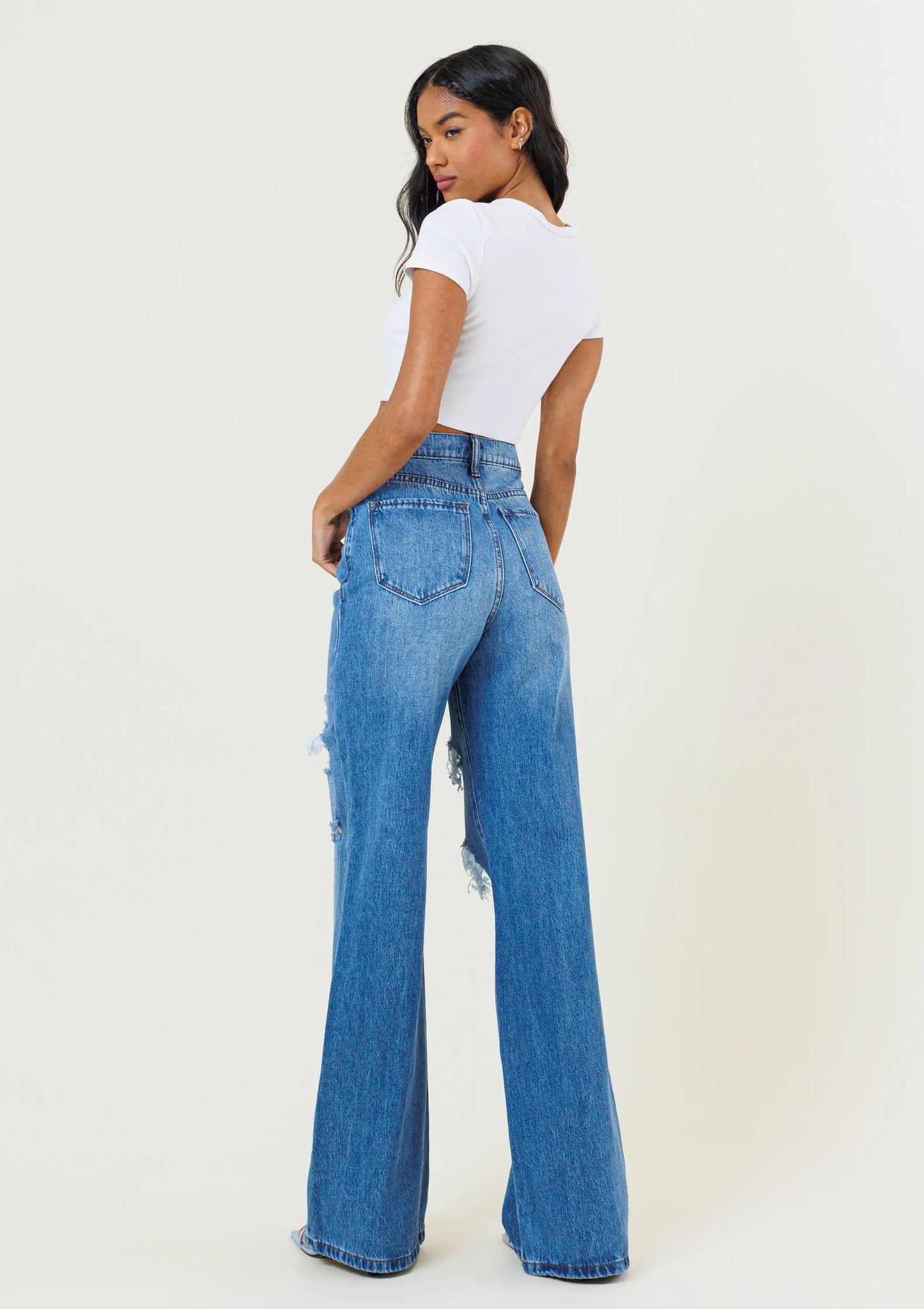 A pair of high-rise wide fit jeans featuring distressed details on the front, classic 5-pocket construction and a zip-fly closure. Rise: 12.5", inseam: 33.5" (measurements taken from size 3) Model is 5’8” and wearing a size 3 True to size