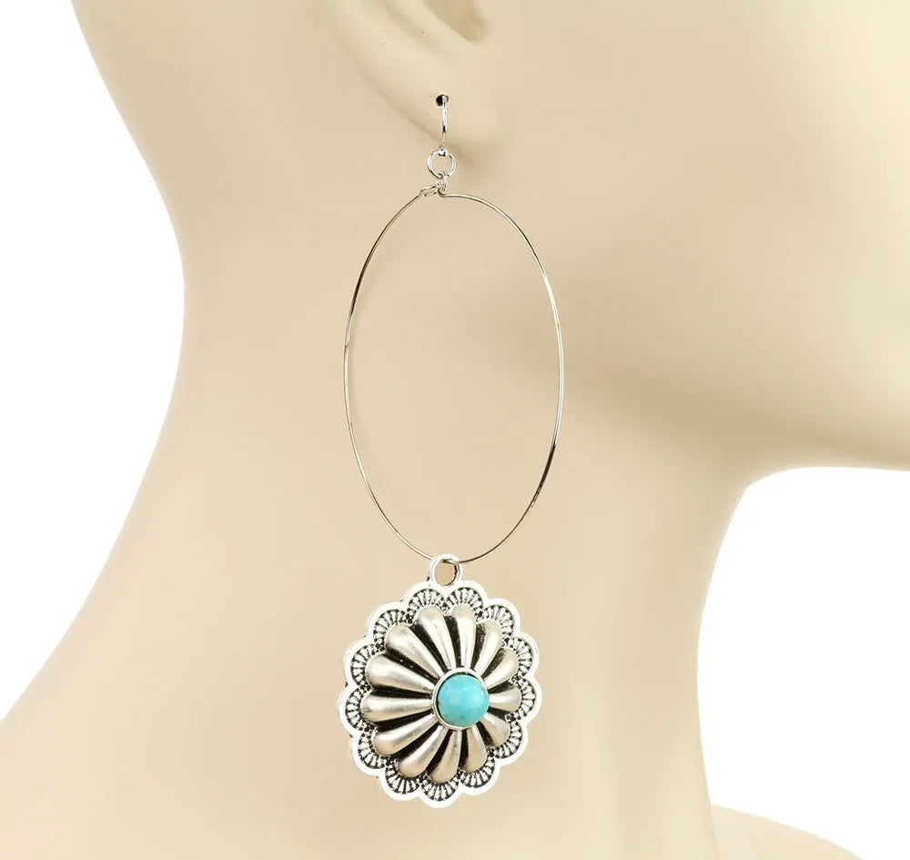 * Natural stone may vary in size, color or shape * 4.5″ long earrings & fish hook * 2.5″(65mm) diameter hoop * 1.5″ long concho * Each earring 12 grams weight * Alloy metal * Antique silver plate * Nickel, Lead & Chrome free