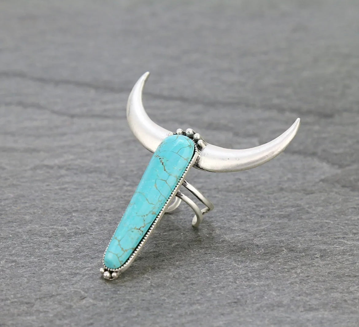 Semi Stone Steer Adjustable Ring with Double Band* Semi Stones may vary in size, color, or shape* One size, Adjustable size & position by pull/push silvertone ring double band* 2.5″ long natural stone ring* 15 grams weight* Antique silver plate* Nickel, Lead & Chrome free