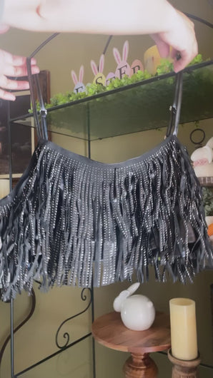 - Skinny strap fringe crop top, fringe with silver studded details, straps are adjustable