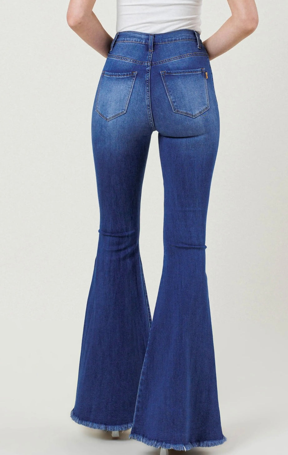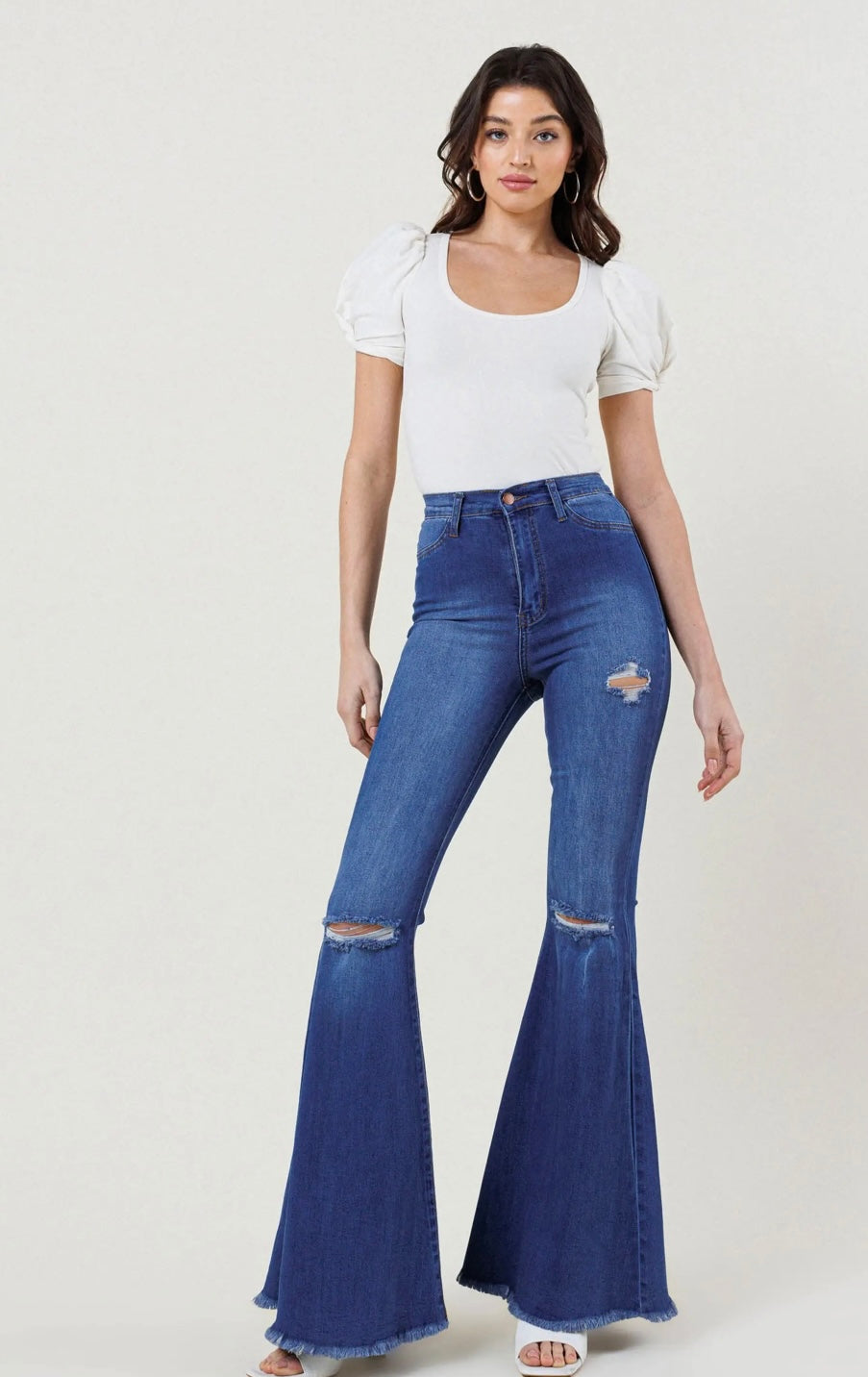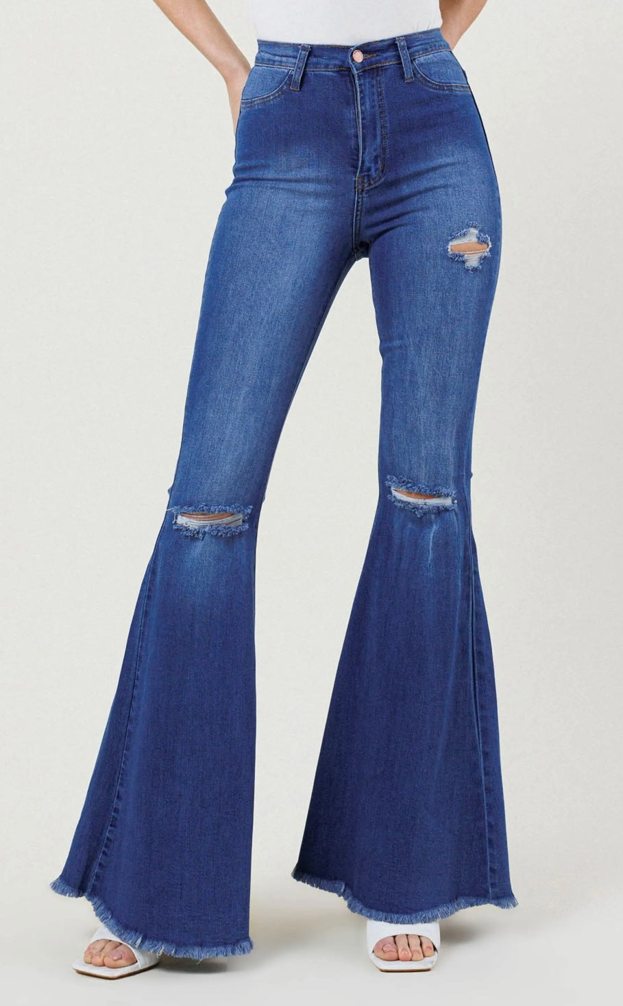 A pair of extreme flare jeans featuring a light distressed design, raw frayed hem, and ripped knee slits. These jeans offer two back patch pockets, faux front pockets, and zip-fly closure. -Rise: 10.5", Inseam: 33.5" (Measurements taken from a size 3)"