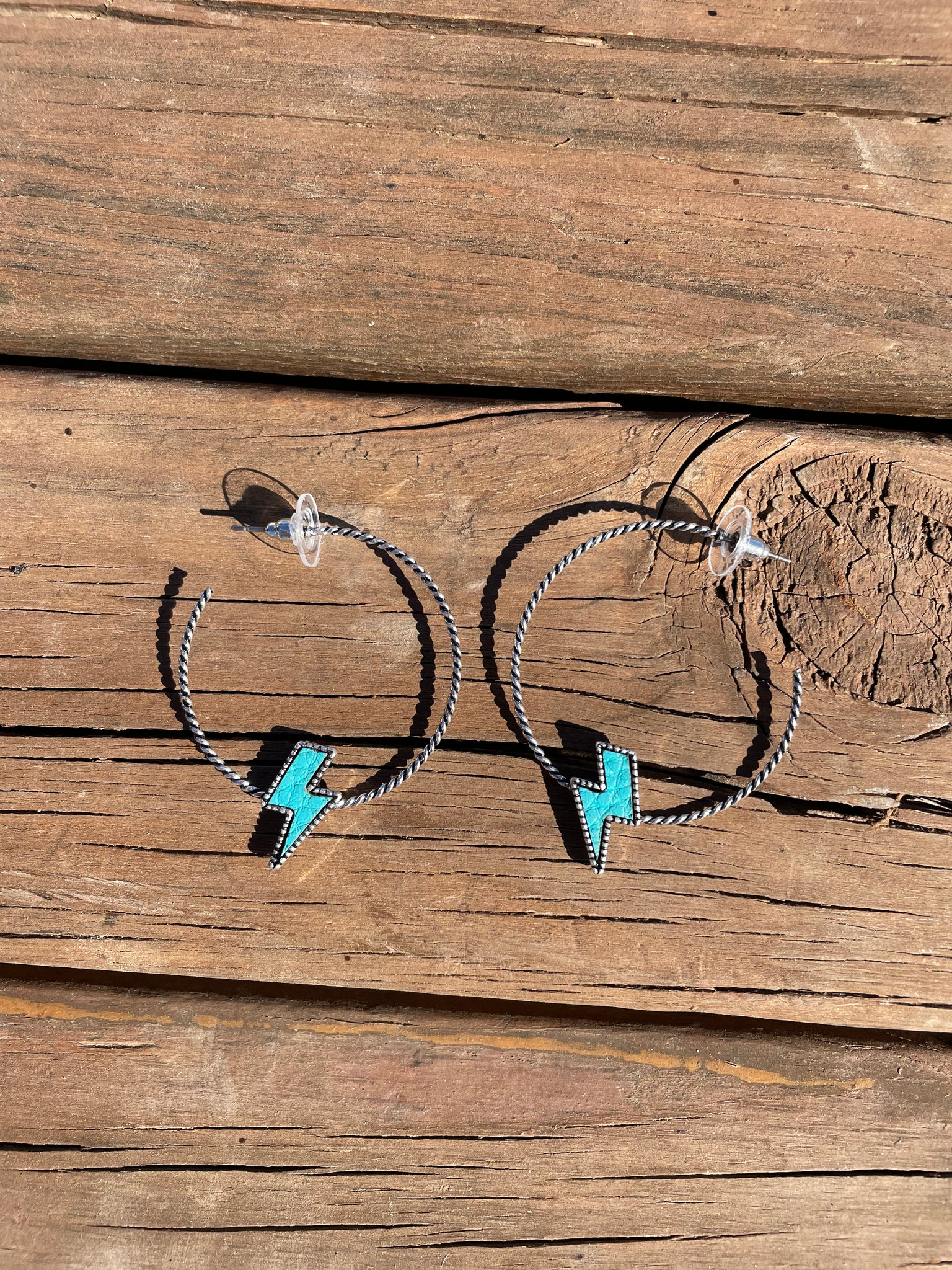 OMG!!! Beautiful hoop earrings that are a need in your collection! Western thunder bolt hoop earrings available in both zarape and turquoise!